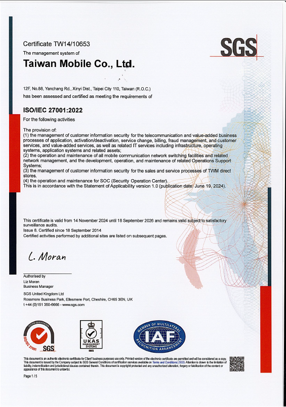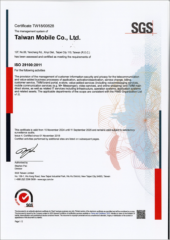 Taiwan Mobile adopts ISO 27001 information security management system, and its privacy protection has obtained ISO27701 privacy protection management certification. Both of them refer to ISO 27005 risk management standard to identify and manage risks. Taiwan Mobile has set up the Cyber Security and Data Privacy Protection Committee, which invites independent directors, Dr. Chung who has Information and security related background during his term of office at the Executive Yuan (the Cabinet) of Taiwan, for observation and invest resources to implement control. TWM handles internal and third-party audits every six months. Here is an overview of its operations: