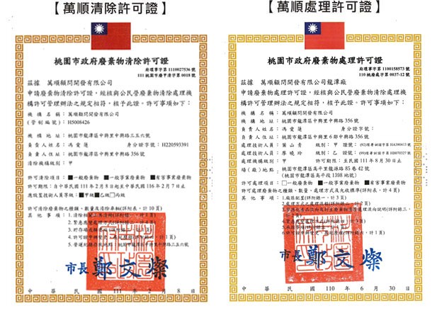 Taoyuan City Waste Processing Permit No. 0228-1, issued in 2023 (Document No. 112 Taoyuan City Waste-A Disposal Document 0228-1), valid until October 2028.