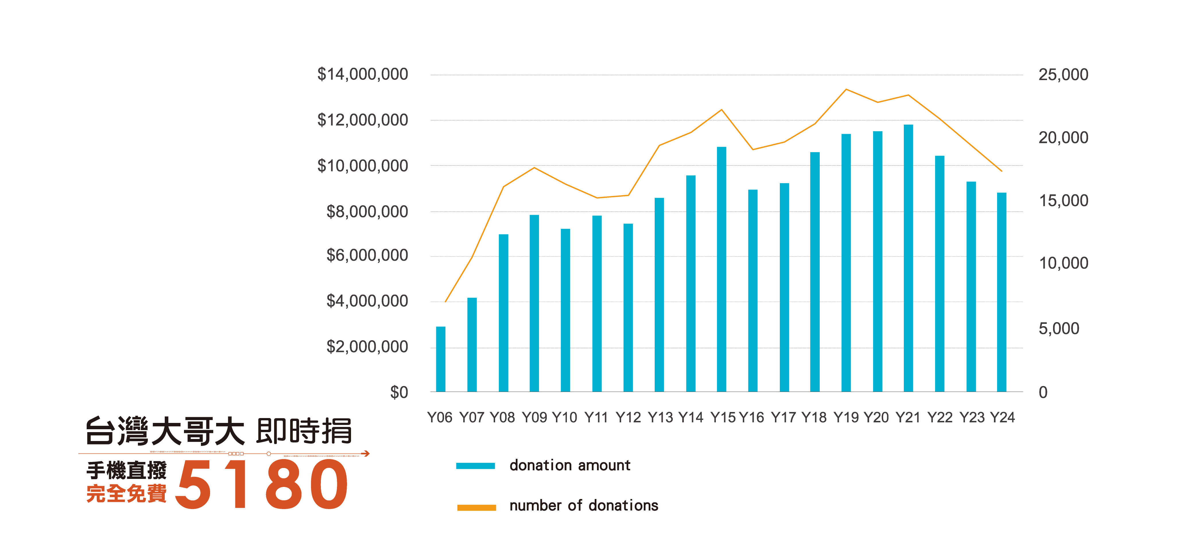 Cumulative donation amount from 2006 to 2024 : NT$165 million ; and total number of donations from