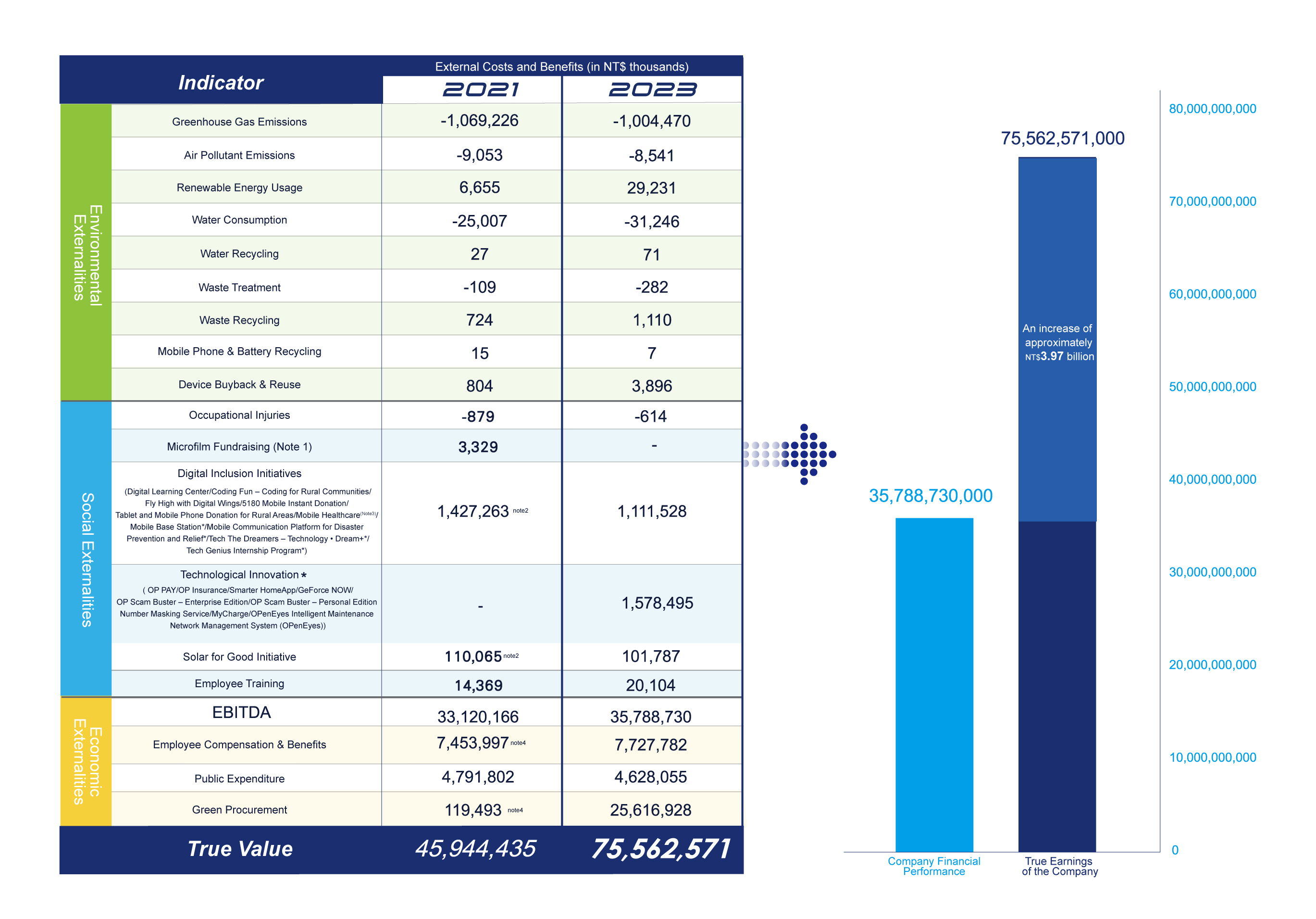 Since 2015, TWM has conducted biennial assessments of its True Value—an evaluation of TWM’s environmental, social, and economic impacts. In 2024, the assessment was completed for the year 2023. TWM’s True Value in 2023 exceeded its financial performance by approximately NT$3.97 billion.