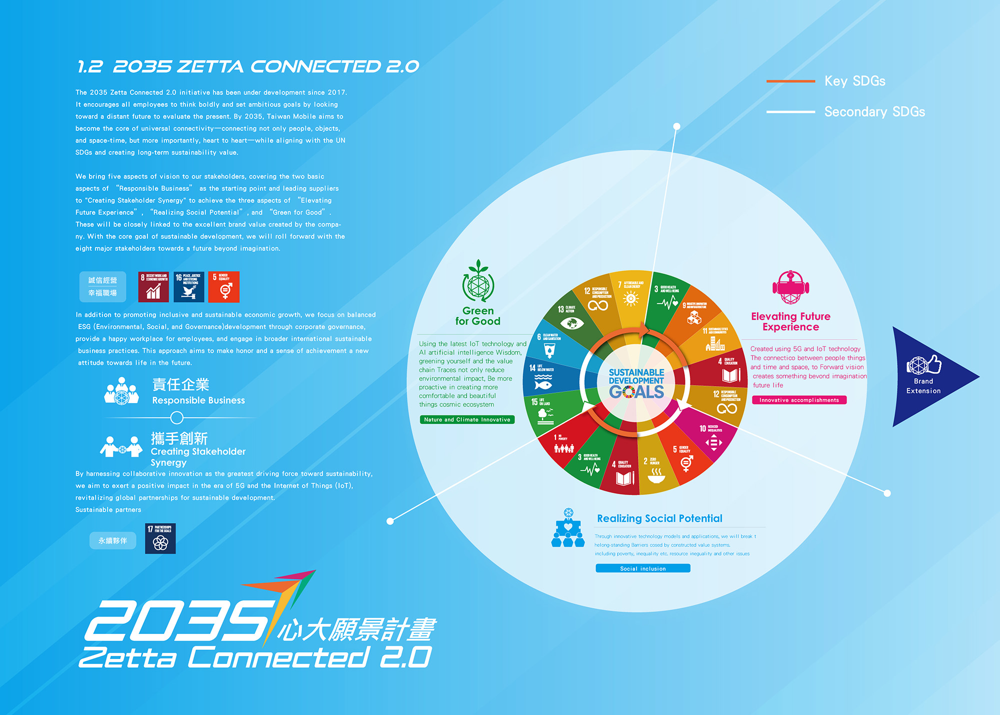At the end of 2017, TWM adopted "Zetta Connected 2030" (the homophone of "big heart" is Zetta) as the theme of the vision plan for 2020-2030. We hope that all colleagues in the company will bravely assume, actively set goals, and strive to review what they should do now from the perspective of the distant future. In 2022, the Zetta Connected plan was extended and renamed "Zetta Connected 2.0”. We hope that by 2035, Taiwan will become the core linking all things, not only connecting people, things, time, and space, but more importantly, connecting hearts. With this, we respond to the United Nations SDGs and create sustainable value.