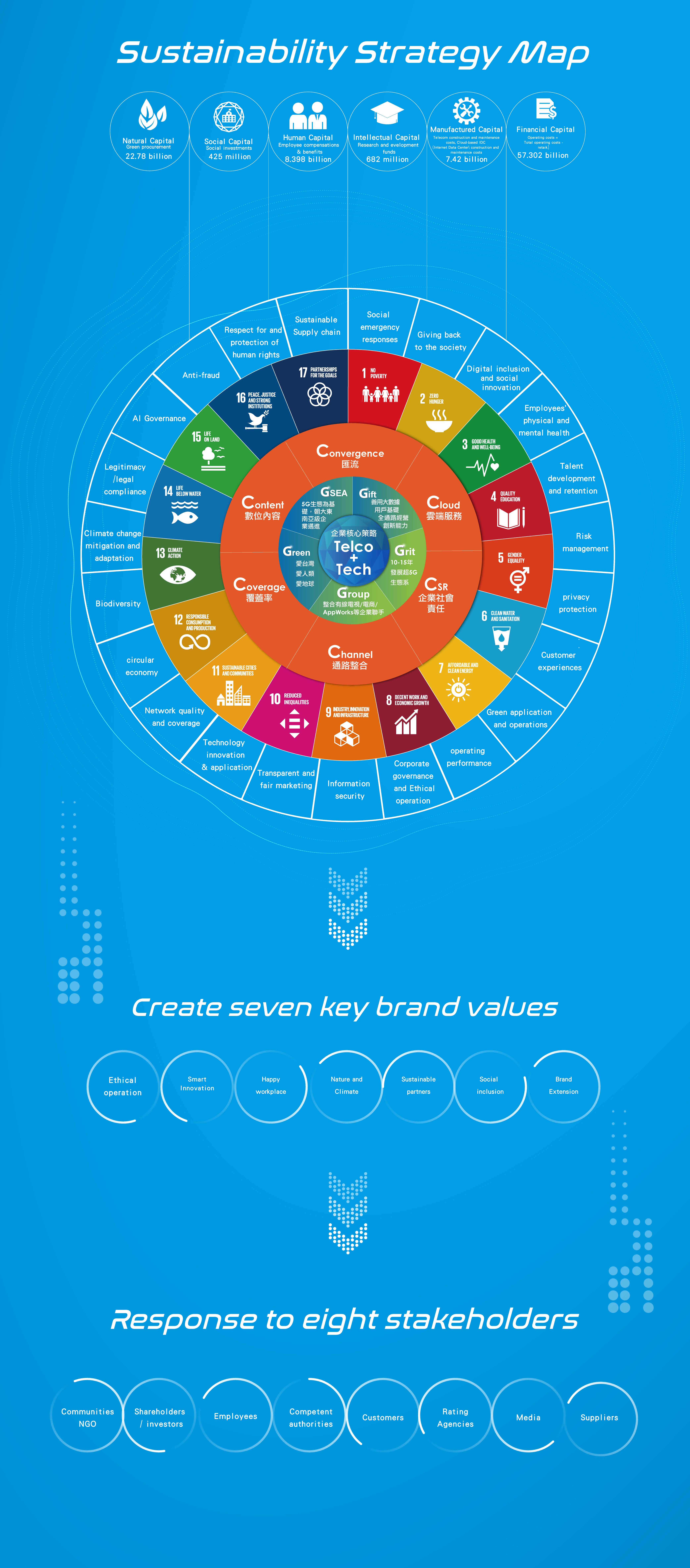 Taiwan Mobile has invested six categories of capital in our “Telco+Tech” diversification strategy blueprint and established our new Super 5G strategy and 6C operating core corresponding to the 17 UN SDGs to achieve the ESG goals. In 2024, TWM identified 23 material topics and "2035 Zetta Connected 2.0” remains to be a guiding standard for sustainable operations. This approach is helping us respond to the concerns and expectations of our eight major stakeholders and create value for TWM’s brands.