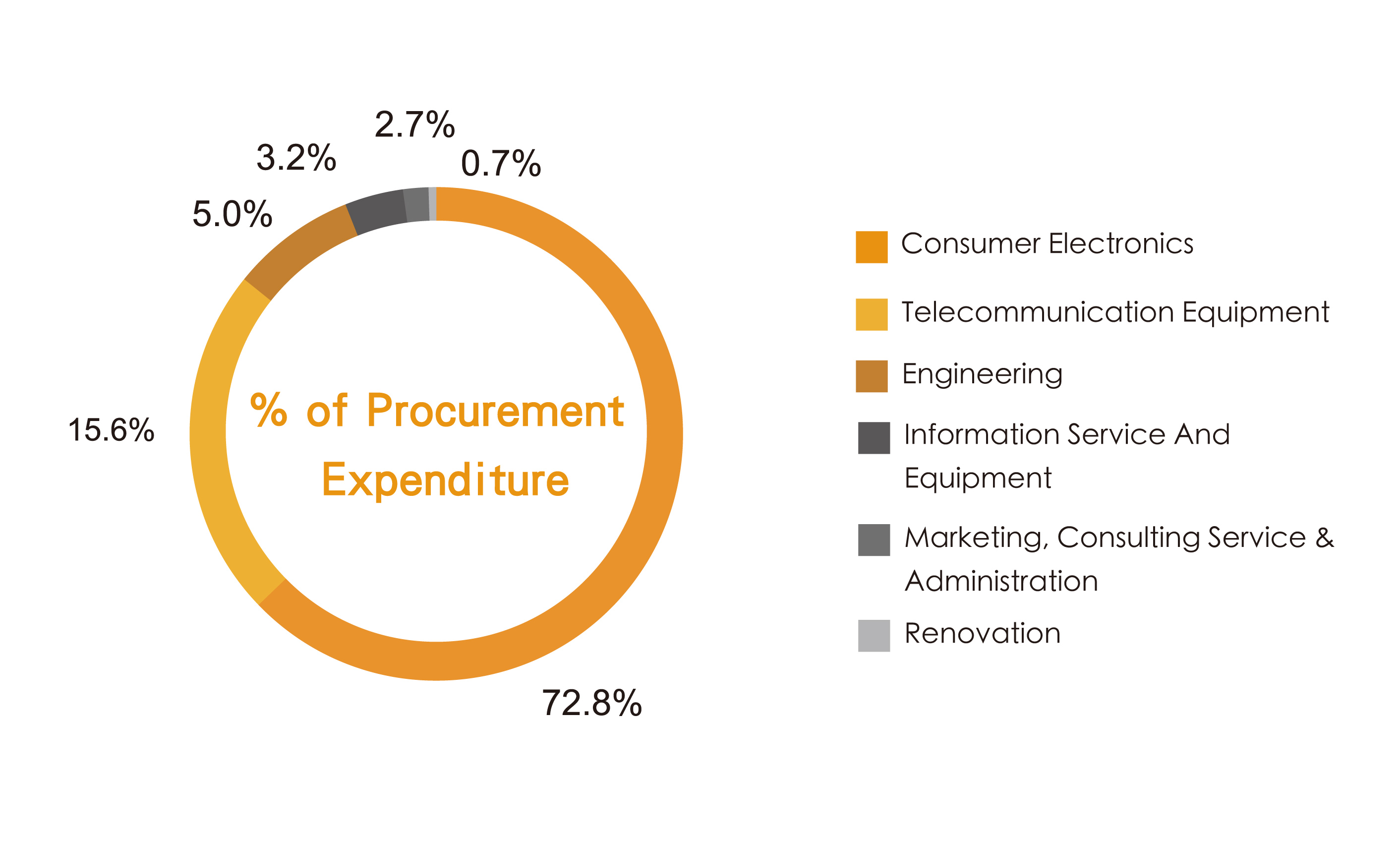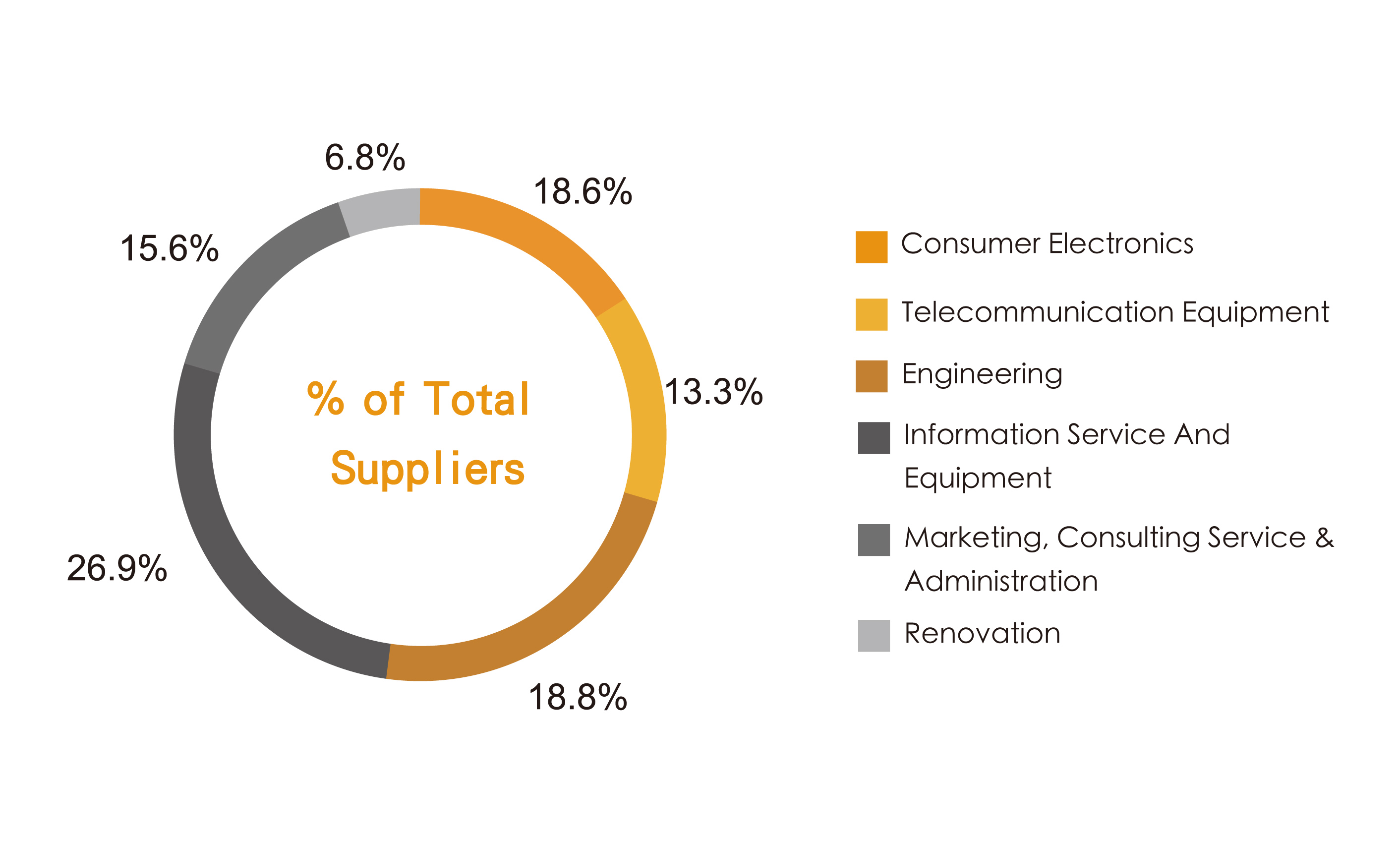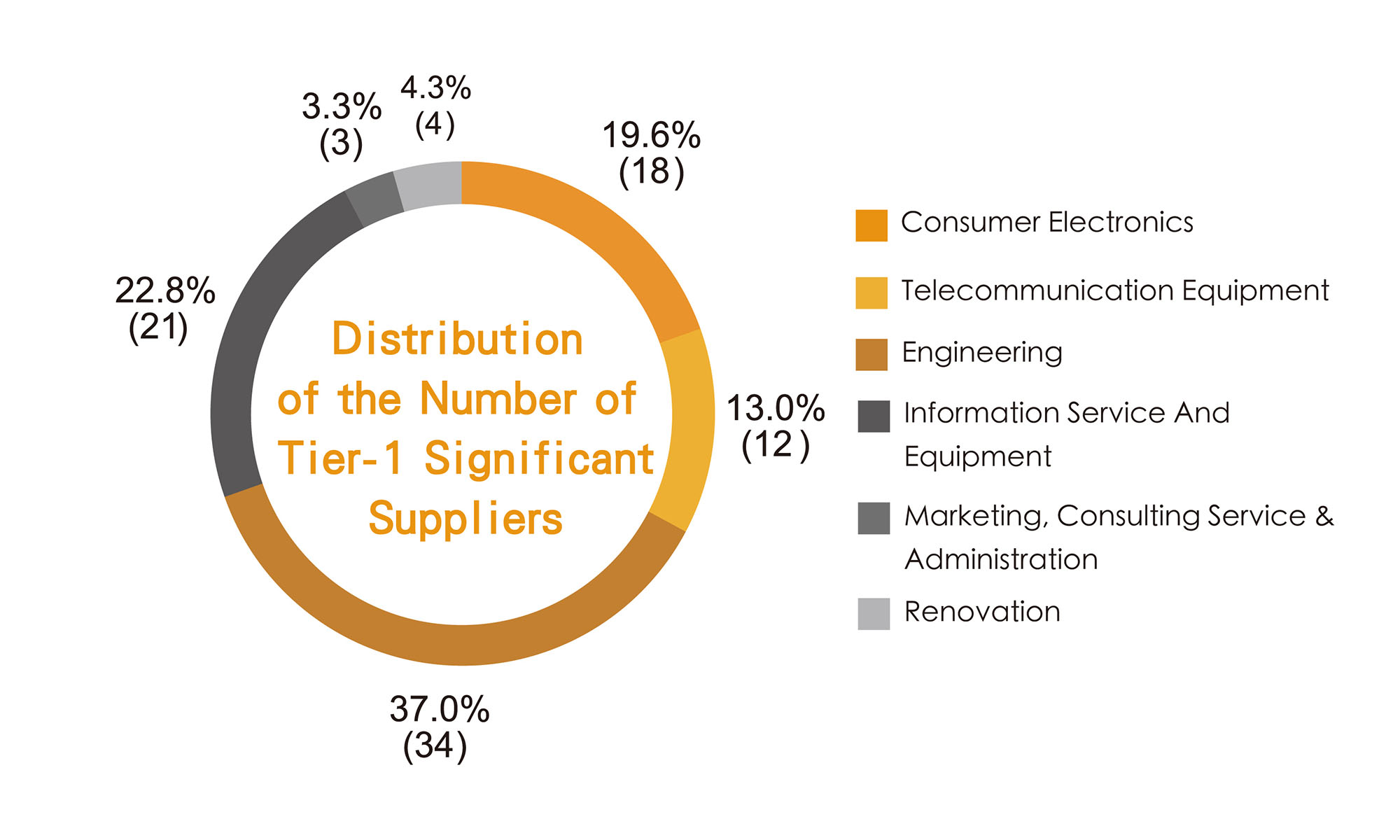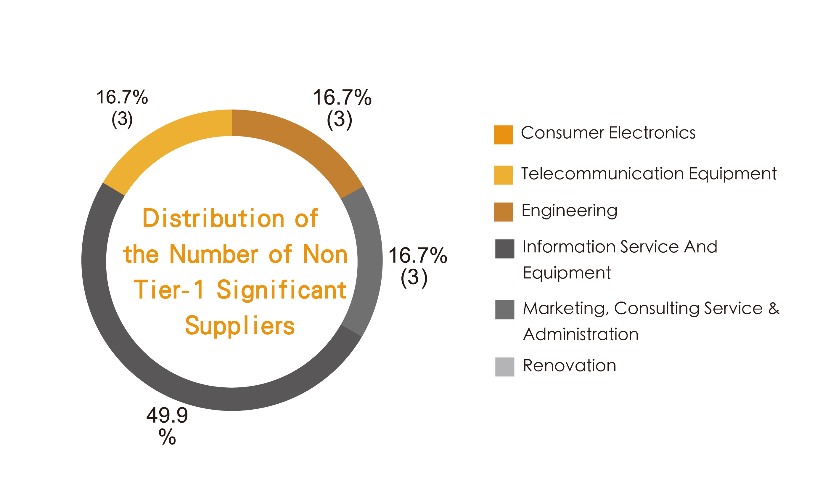 Considering the significant business relevance of suppliers to Taiwan Mobile, as well as substantial risks of negative ESG impacts, we selected ESG risk assessment scores, procurement amounts, and irreplaceability as factors for identifying significant suppliers. Based on the above six categories of suppliers, thresholds were set respectively to identify significant suppliers, totaling 110 as follows.